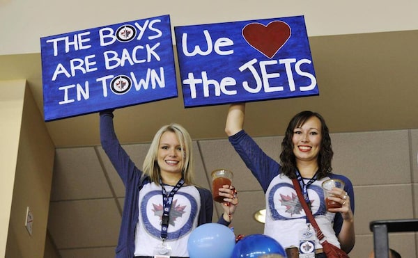 Winnipeg Jets fans cheer as their team plays the Montreal Canadiens during the first period of their NHL hockey game in Winnipeg, Manitoba, October 9, 2011.FRED GREENSLADE/Reuters