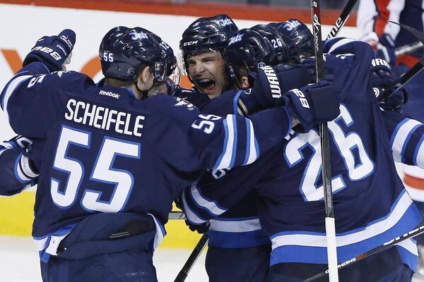 Winnipeg Jets' Mark Scheifele (55), Mark Stuart (5) and Blake Wheeler (26) celebrate Stuart's goal against the Washington Capitals during first period NHL action in Winnipeg on Saturday, March 21, 2015.JOHN WOODS/The Canadian Press