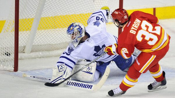 In the second period, Phaneuf hooked a speeding Byron to force a penalty shot. Byron went to his forehand and beat Gustavsson to make the score 3-1. The goal was Byron's third this season. Blake Comeau and Iginla also scored for Calgary.