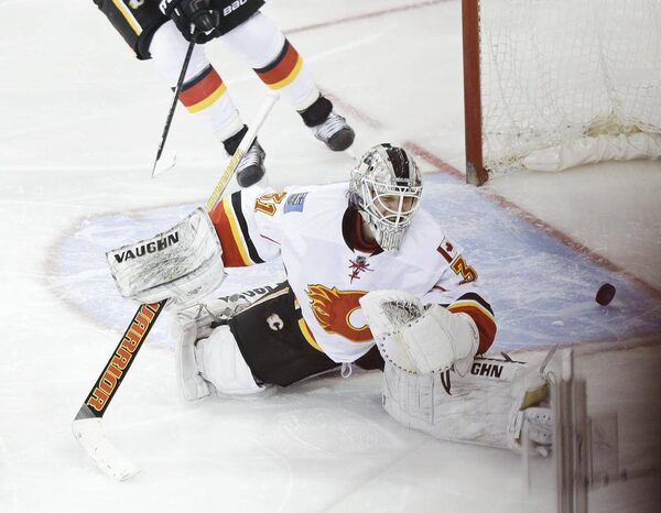 Calgary Flames goalie Karri Ramo reacts as a puck shot by New York Rangers' Kevin Hayes gets past him for a goal during the third period of an NHL hockey game Tuesday, Feb. 24, 2015, in New York. The Rangers won the game 1-0.Frank Franklin II/The Associated Press