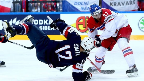 Jakub Nakladal, right, of Czech Republic and Ben Smith of USA battle for the puck during the IIHF World Championship bronze-medal match between Crech Republic and USA at O2 Arena on May 17, 2015 in Prague.