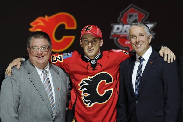Morgan Klimchuk, a winger, stands with officials from the Calgary Flames sweater after being chosen 28th overall in the first round of the NHL draft, Sunday, June 30, 2013, in Newark, N.J.Bill Kostroun/The Associated Press