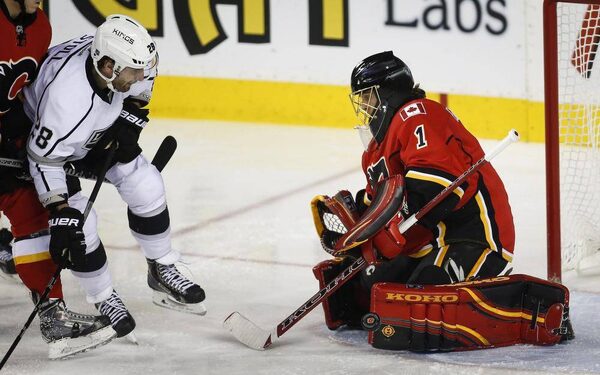 Los Angeles Kings Jarret Stoll, left, has his shot deflected by Calgary Flames goalie Jonas Hiller, from Switzerland, during third period NHL hockey action in Calgary, Monday, Dec. 29, 2014.Jeff McIntosh/The Canadian Press