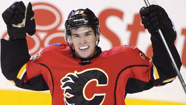 Calgary Flames' Sean Monahan celebrates scoring the winning goal against the New Jersey Devils during third period NHL action in Calgary, Alta., Friday, October 11, 2013.The Canadian Press
