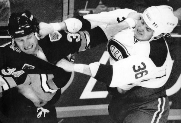 Montreal Canadiens Todd Ewen (R) and Boston Bruins Lyndon Byers trade punches during a brawl in a NHL game in January 1990.The Canadian Press