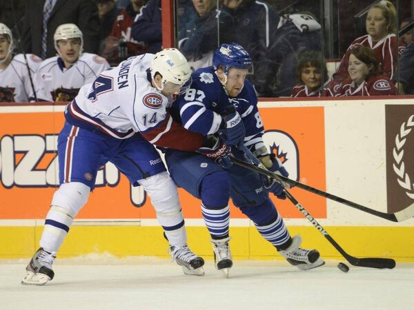 Hamilton Bulldogs' Mike Blunden fights for control of the puck with Toronto Marlies' Leo Komarov during first period AHL action in Hamilton, Ont., on Friday, November 16, 2012.Kaz Novak/The Canadian Press