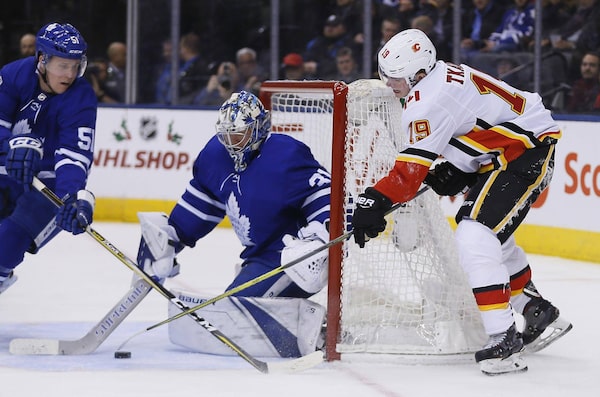 Calgary Flames forward Matthew Tkachuk controls the puck against Toronto Maple Leafs goaltender Frederik Andersen and defenceman Jake Gardiner on Dec. 6, 2017.John E. Sokolowski/The Globe and Mail
