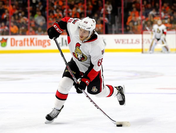Mike Hoffman of the Ottawa Senators takes a shot and scores a goal against the Philadelphia Flyers on April 2, 2016.Elsa/Getty Images
