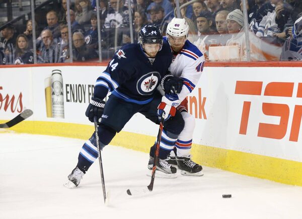 Winnipeg Jets defenseman Josh Morrissey (44) battles for the puck against New York Rangers right wing Michael Grabner (40) during the third period at MTS Centre.Bruce Fedyck