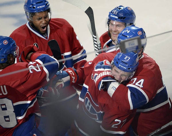Montreal Canadiens center Alex Galchenyuk (27) celebrates with teammates after scoring the winning goal during the first overtime period of Game 2 NHL first round playoff hockey action against the Ottawa Senators Friday, April 17, 2015 in Montreal.Ryan Remiorz/The Canadian Press