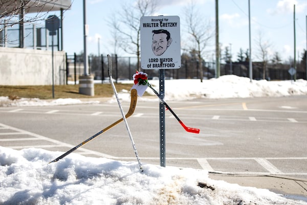 Hockey sticks, cards, and flowers are seen affixed to Walter Gretzky's reserved parking spot at the Wayne Gretzky Sports Centre in Brantford, Ont..Cole Burston/The Canadian Press