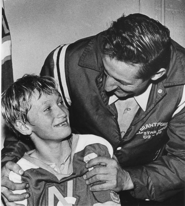 The 5th annual Minor Olympics Hockey Tournament in Hespeler, Ont. Brantford's Wayne Gretzky is congratulated by his father Walter Gretzky, in the dressing room in 1971.Dennis Robinson/The Globe and Mail