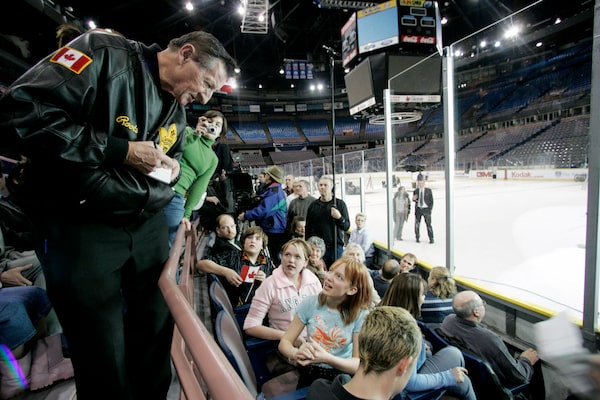 Walter Gretzky autographs the jersey of Christopher Palumbo, 10, of Woodbridge, Ont., at the 38th annual Wayne Gretzky International Hockey Tournament in Brantford, Ont., Dec. 28, 2007.Colin Everett/The Canadian Press
