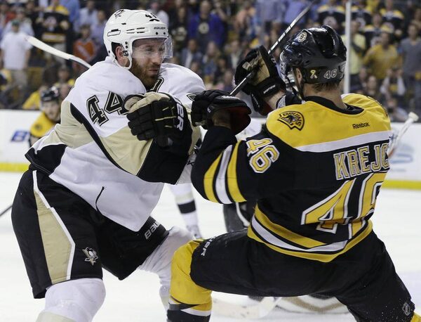 Pittsburgh Penguins defenseman Brooks Orpik (44) checks Boston Bruins center David Krejci (46) during the second period in Game 3 of the Eastern Conference finals in the NHL hockey Stanley Cup playoffs, in Boston on Wednesday, June 5, 2013.Elise Amendola/The Associated Press