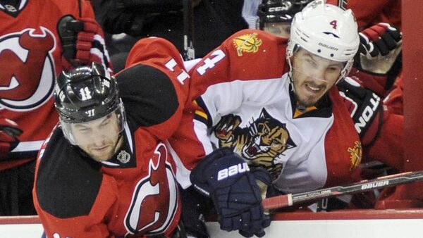 New Jersey Devils Stephen Gionta, left, checks Florida Panthers Keaton Ellerby into the boards during the second period of Game 4 of their NHL Eastern Conference quarter final playoff hockey game in Newark, New Jersey, April 19, 2012.Reuters