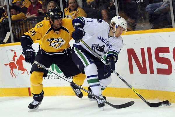 Nashville Predators' Hal Gill (75) and Vancouver Canucks' David Booth (7) tries to control the puck in the first period of an NHL game on Friday, Feb. 22, 2013, in Nashville, Tenn.Mike Strasinger/The Associated Press