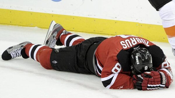 New Jersey Devils' forward Dainius Zubrus lies on the ice after being hit by Philadelphia Flyers' Claude Giroux during the second period in Game 4 of their NHL Eastern Conference semi-final playoff hockey game in Newark, N.J.RAY STUBBLEBINE/Reuters