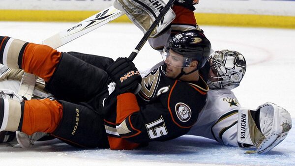 Anaheim Ducks centre Ryan Getzlaf (15) runs into Dallas Stars goalie Kari Lehtonen during the second period of a NHL hockey game in Anaheim, Calif., Friday, Oct. 21, 2011. (AP Photo/Lori Shepler)Lori Shepler/The Associated Press