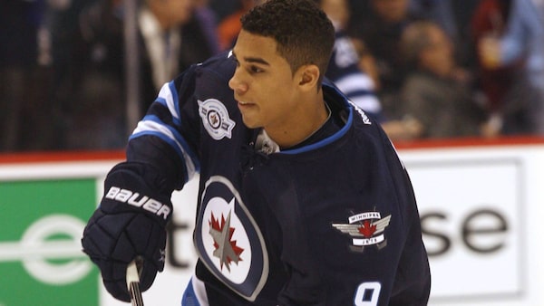 Winnipeg Jets forward Evander Kane(9) before the start of the game against the Montreal Canadiens at the MTS Centre. Mandatory Credit: Bruce Fedyck-US PRESSWIREBruce Fedyck-US PRESSWIRE