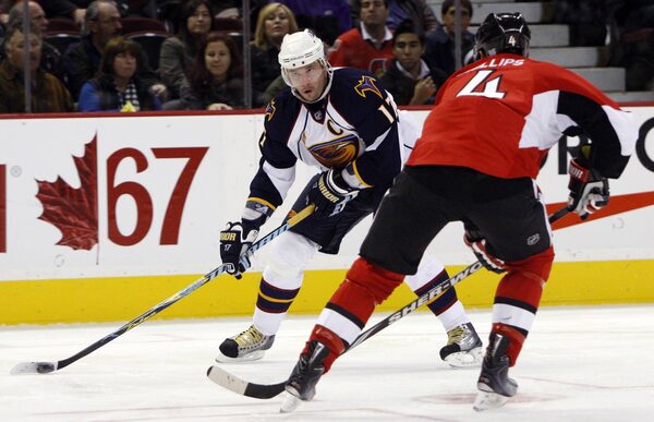 Atlanta Thrashers' Ilya Kovalchuk (L) lines up his shot as Ottawa Senators' Chris Phillips plays defense during the second period of their NHL hockey game in Ottawa October 10, 2009. REUTERS/Blair Gable (CANADA SPORT ICE HOCKEY)BLAIR GABLE/Reuters