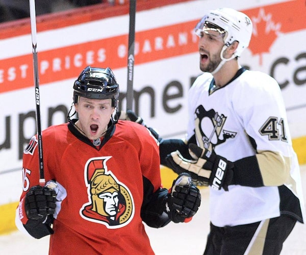 Ottawa Senators' Zack Smith celebrates a first period goal as Pittsburgh Penguins' Robert Bortuzzo skates past during NHL action in Ottawa on Monday, Dec. 23, 2013.Sean Kilpatrick/The Canadian Press
