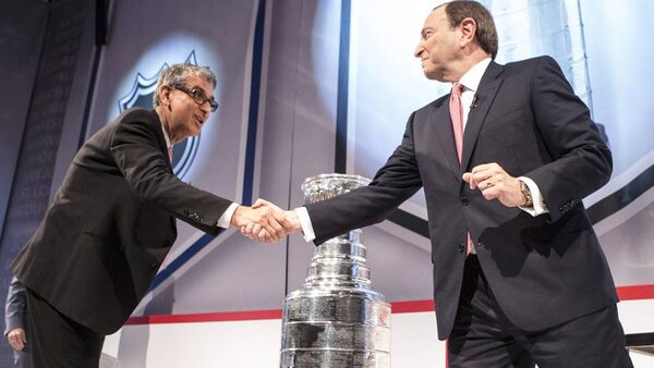 Rogers CEO Nadir Mohamed (left) shakes hands with NHL Commissioner Gary Betman following a news conference in Toronto on Tuesday 26, 2013 as they announced a long term broadcast and multimedia agreement, which provides Rogers with all national rights.The Canadian Press