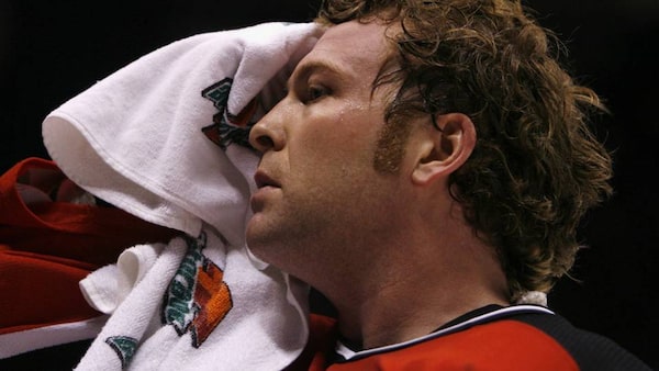 New Jersey Devils goalie Martin Brodeur towels off after the overtime period of their NHL hockey game with the Toronto Maple Leafs in East Rutherford, New Jersey, March 2, 2007.Reuters