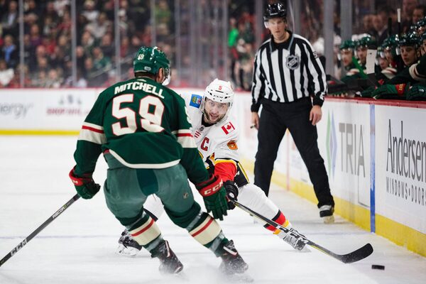 Calgary Flames defenceman Mark Giordano passes the puck around Minnesota Wild right wing Zack Mitchell during the first period at Xcel Energy Center in Saint Paul, on Dec. 12, 2017.Harrison Barden/The Globe and Mail
