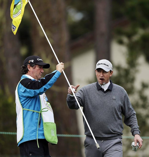 Hockey great Wayne Gretzky puffs on a cigar as he grabs the pin on the second green of the Monterey Peninsula Country Club Shore Course during the first round of the AT&T Pebble Beach Pro-Am golf tournament, Thursday, Feb. 7, 2013, in Pebble Beach, Calif.Ben Margot/The Associated Press