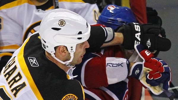 Boston Bruins defenseman Zdeno Chara (L) hits Montreal Canadiens Max Pacioretty into a glass stanchion during the second period of NHL hockey play in Montreal, March 8, 2011. According to media reports, Pacioretty suffered a broken vertebra and severe concussion on the play. Picture taken March 8, 2011.Shaun Best/Reuters