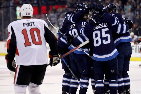 The Winnipeg Jets celebrate a goal by Tyler Myers during the second period in Winnipeg, on Dec. 3, 2017.Trevor Hagan/The Globe and Mail