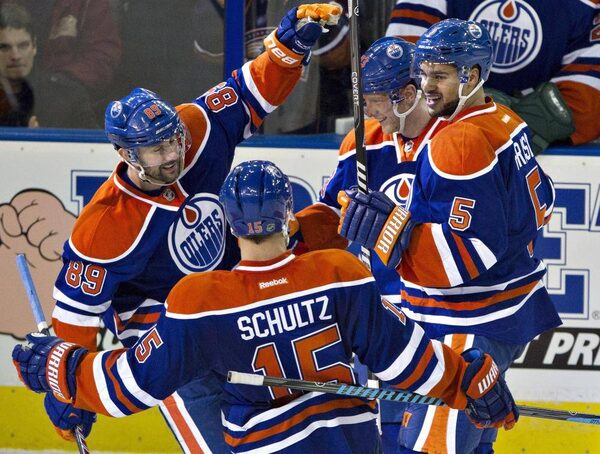 Edmonton Oilers' Sam Gagner (89), Nick Schultz (15), Ales Hemsky (83) and Mark Fraser (5) celebrate a goal against the Ottawa Senators during second period NHL hockey action in Edmonton, Alta., on Tuesday March 4, 2014.JASON FRANSON/The Canadian Press