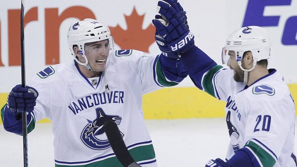 Vancouver Canucks' Chris Higgins (20) and Alexandre Burrows (14) celebrate Higgins' winning shoot out goal over the Winnipeg Jets in NHL action in Winnipeg on Wednesday, March 12, 2014. The Canucks defeated the Jets 3-2.