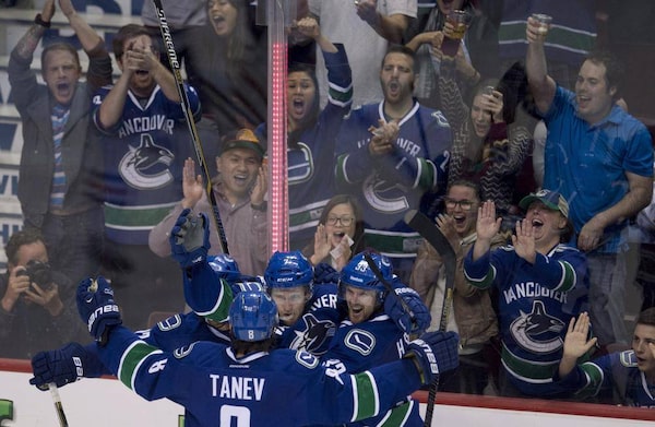 Vancouver Canucks right wing Linden Vey (7) celebrates his goal with teammates Henrik Sedin (33) and Chris Tanev (8) during the third period of NHL action against the Edmonton Oilers in Vancouver, B.C. Saturday, Oct. 11, 2014.JONATHAN HAYWARD/The Canadian Press