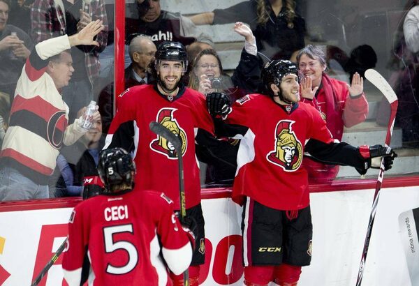 Ottawa Senators left wing Mike Hoffman (right) celebrates his goal with teammates Jared Cowen and Cody Ceci during second period NHL action against the Anaheim Ducks Friday December 19, 2014 in Ottawa. The Ottawa Senators defeated the Ducks 6-2.Adrian Wyld/The Canadian Press
