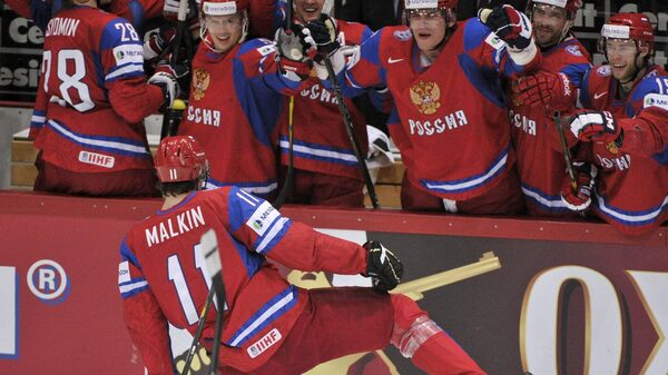 Russia's Yevgeni Malkin celebrates his third goal during the semi-final match Russia vs Finland of the 2012 IIHF World Championships in Helsinki, Finland, on Saturday May 19, 2012.Kimmo Mantyla/AP