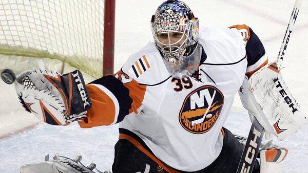 New York Islanders goaltender Rick DiPietro makes a save against Montreal Canadiens during first period NHL hockey action in Montreal February 2, 2008.Reuters