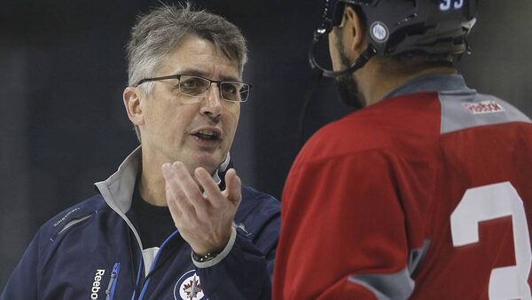 Winnipeg Jets head coach Claude Noel talks to Dustin Byfuglien (33) on day three of training camp in Winnipeg on Tuesday, January 15, 2013.The Canadian Press