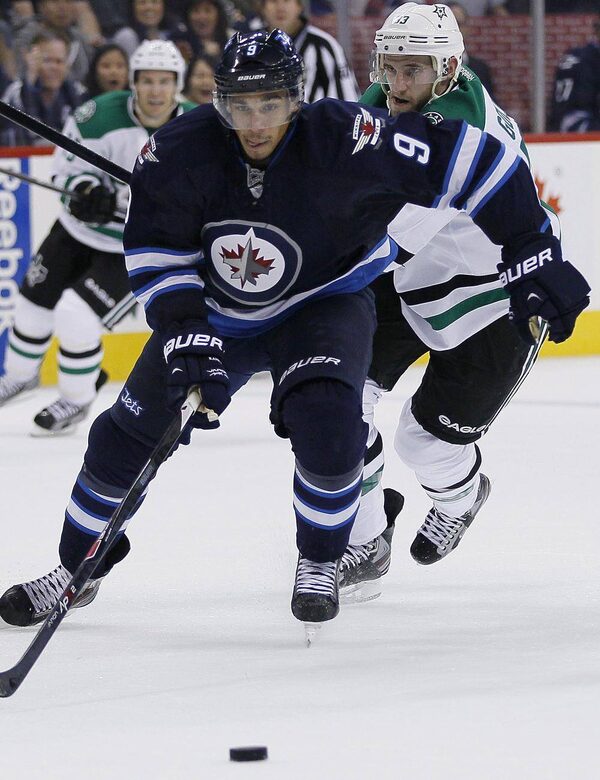 Winnipeg Jets' Evander Kane (9) breaks away during second period NHL action in Winnipeg on Friday, October 11, 2013.JOHN WOODS/The Canadian Press