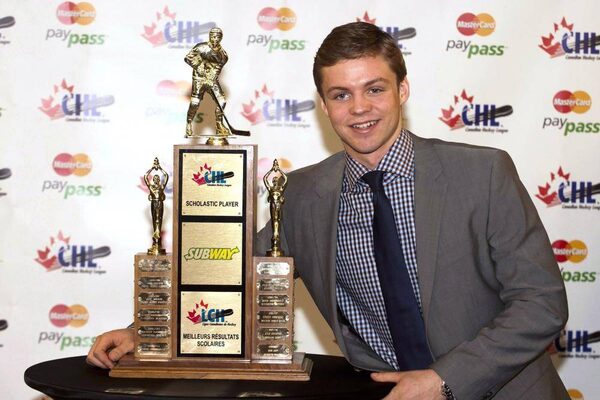 Josh Morrissey of the Prince Albert Raiders receives the Scholastic Player of the Year Trophy during the 2012-13 CHL Awards Ceremony in Saskatoon, Sask. on Saturday, May 25, 2013.Liam Richards/The Canadian Press