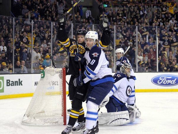 Boston Bruins centre Carl Soderberg (34) reacts after goal while Winnipeg Jets defenceman Jacob Trouba (8) skates away during the second period at TD Banknorth Garden.Bob DeChiara