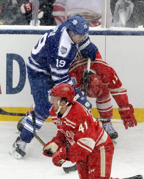 Toronto Maple Leafs right wing Joffrey Lupul (19) cross checks Detroit Red Wings forward Patrick Eaves during the first period of the Winter Classic outdoor NHL hockey game at Michigan Stadium in Ann Arbor, Mich., Wednesday, Jan. 1, 2014.Carlos Osorio/The Associated Press