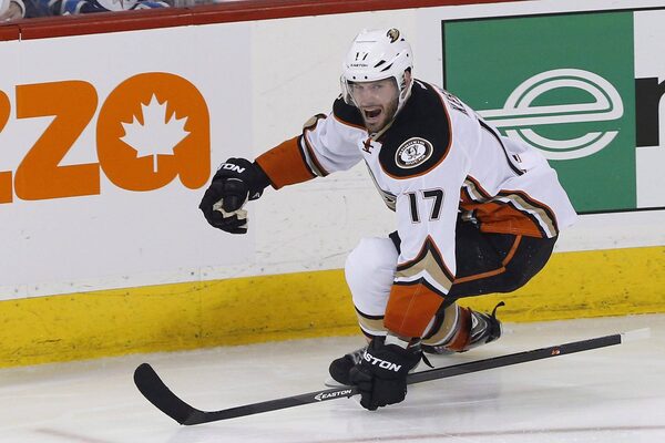 Anaheim Ducks' Ryan Kesler celebrates his goal against the Winnipeg Jets during third period NHL game four playoff action in Winnipeg on Wednesday, April 22, 2015. Kesler is right at home with Jakob Silfverberg on his wing and Canadian fans booing him until their throats are hoarse.JOHN WOODS/The Canadian Press