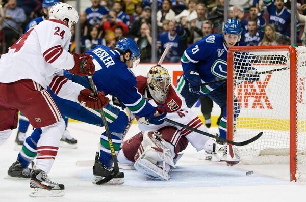 Kesler's goal came 7:26 into the game. Alex Edler intercepted a puck in front of Schneider and, in stride, carried it ahead before whipping a pass to Kassian. The erratic 22-year-old winger brought the puck down low near Phoenix goaltender Mike Smith but didn't have much of a move to make, with a Coyotes defenceman blocking his options. Kassian whipped it back to Kevin Bieksa, who whiffed a shot at the net and Raymond managed to get a stick on the rebound on the left side of Smith, the puck squeaking behind the goaltender and touching the opposite post before Kesler whacked it in – a huge smile breaking wide on his face, beaming like spring sunshine in Vancouver.