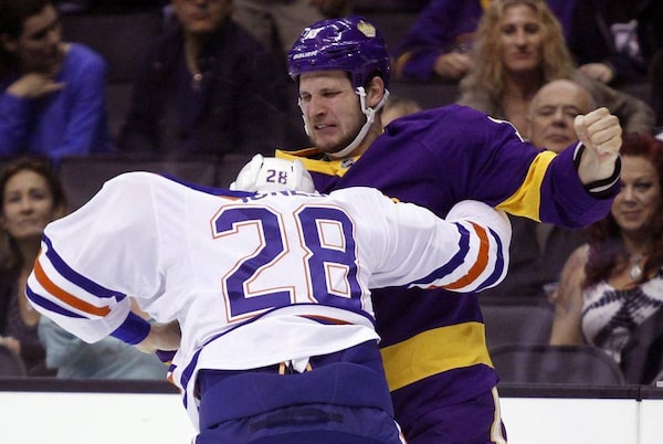 Los Angeles Kings left wing Kyle Clifford, right, scuffles with Edmonton Oilers left wing Ryan Jones (28) during the second period of an NHL hockey game Sunday, Oct. 27, 2013, in Los Angeles.ALEX GALLARDO/The Associated Press
