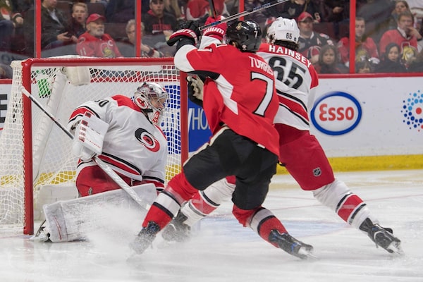 Carolina Hurricanes goalie Cam Ward (30) makes a save in front of Ottawa Senators centre Kyle Turris (7) in the second period at the Canadian Tire Centre in Ottawa on Nov. 26, 2016.Marc DesRosiers