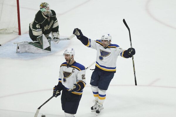 St. Louis Blues' David Perron (57) and Alex Pietrangelo (27) celebrate after their team scored the winning goal against the Minnesota Wild during the third period of Game 2 of an NHL hockey first-round playoff series Friday, April 14, 2017, in St. Paul, Minn.Stacy Bengs/The Associated Press