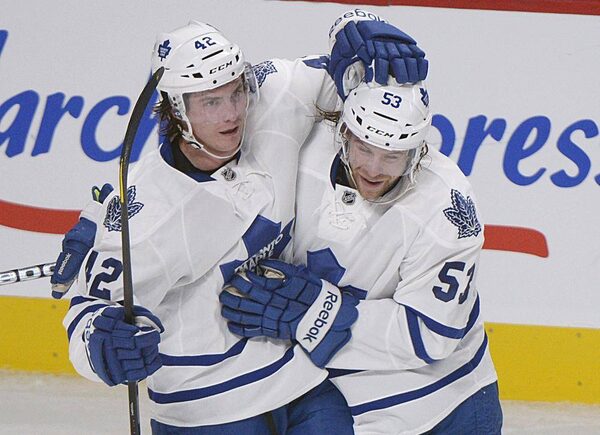 Toronto Maple Leafs' Tyler Bozak, left, celebrates with teammate Michael Kostka after scoring against the Montreal Canadiens during second period NHL hockey action in Montreal, Saturday, January 19, 2013. The Leafs won 2-1.Graham Hughes/The Canadian Press