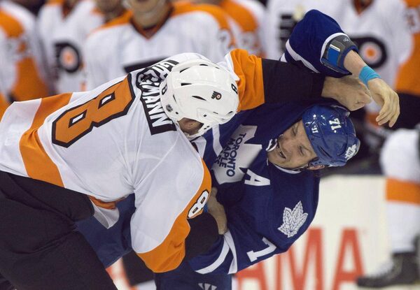 Philadelphia Flyers defenceman Nicklas Grossmann and Toronto Maple Leafs David Clarkson tussle during NHL pre-season action in TorontoFrank Gunn/The Canadian Press