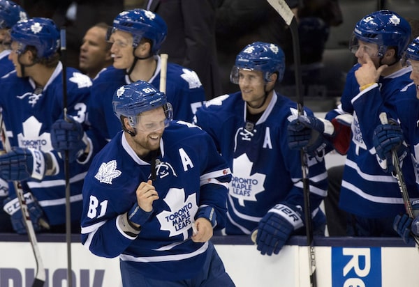 Toronto Maple Leafs Phil Kessel smiles as he is applauded by teammates after winining a fight with Buffalo Sabres Brian Flynn during third period NHL pre-season action in Toronto on Sunday September 22, 2013.FRANK GUNN/The Canadian Press